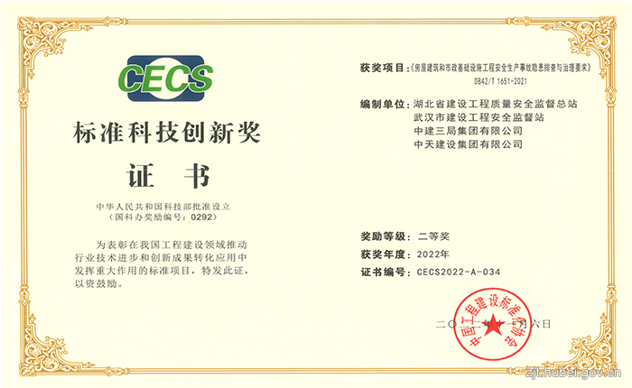 2023年2月28日,由中國工程建設標準化協會舉辦的2022年度標準科技創新獎頒獎典禮在京舉行。湖北省建設工程質量安全監督總站會同武漢市建設工程安全監督站、中建三局集團有限公司、中天建設集團有限公司等單位編制的《房屋建筑和市政基礎設施工程安全生產事故隱患排查與治理要求》(DB42/T 1651-2021)獲得“標準科技創新獎”項目獎二等獎。